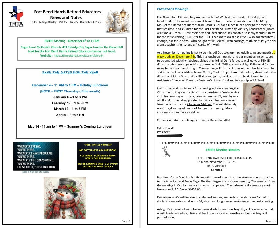 Fort Bend Harris Retired Educators was established in 2001. It is an affiliate of the Texas Retired Teachers Association (TRTA).